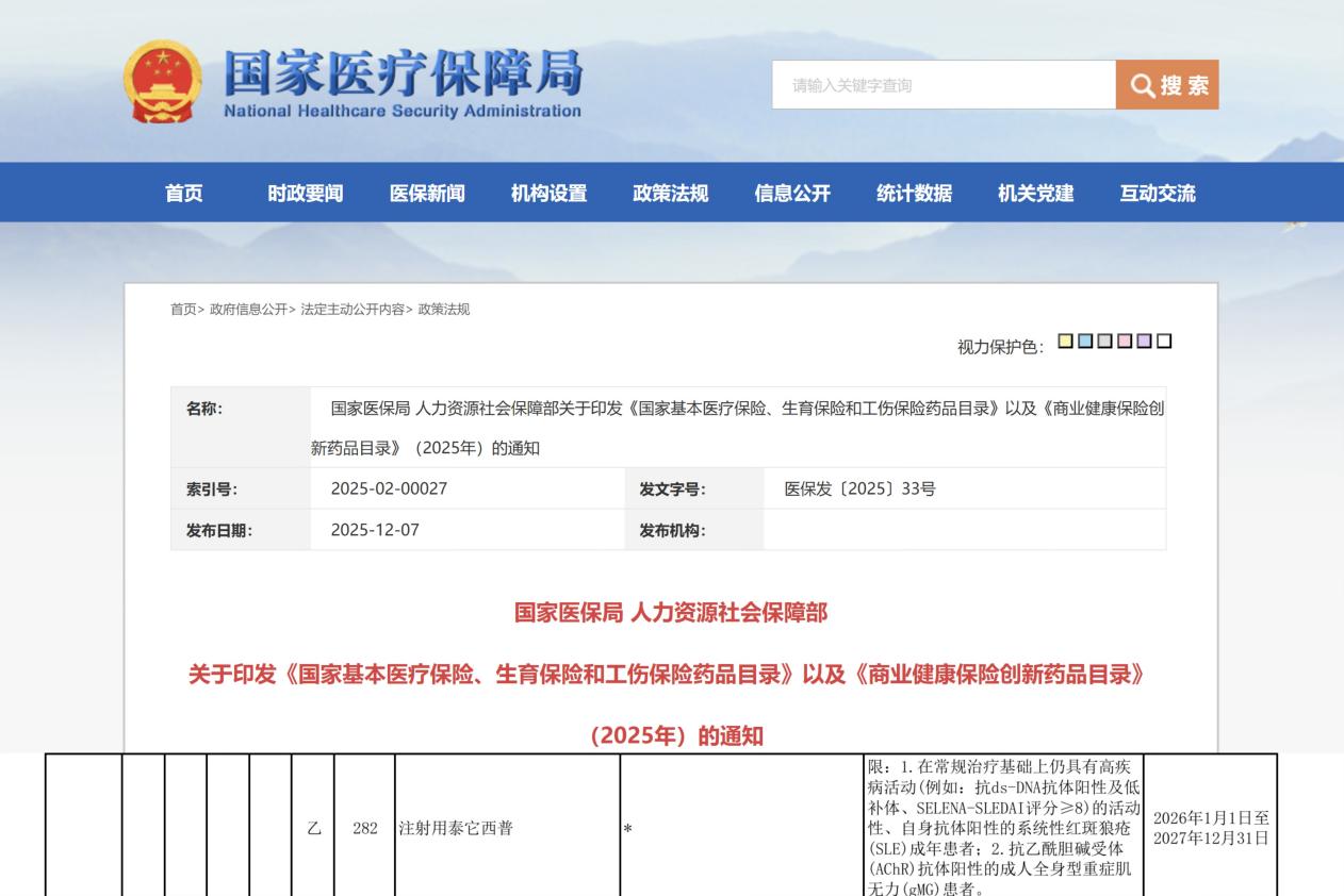 2025年5月我国自主研发的创新型双靶点生物制剂注射用泰它西普获国家药品监督管理局批准,新增第三个适应症,适用于抗AChR抗体阳性的成人gMG患者。2025年12月7日发布的《2025年国家基本医疗保险、工伤保险和生育保险药品目录》,泰它西普治疗gMG的适应症首次被纳入其中,成为新版医保目录中gMG领域唯一采用皮下注射且新增的生物制剂。